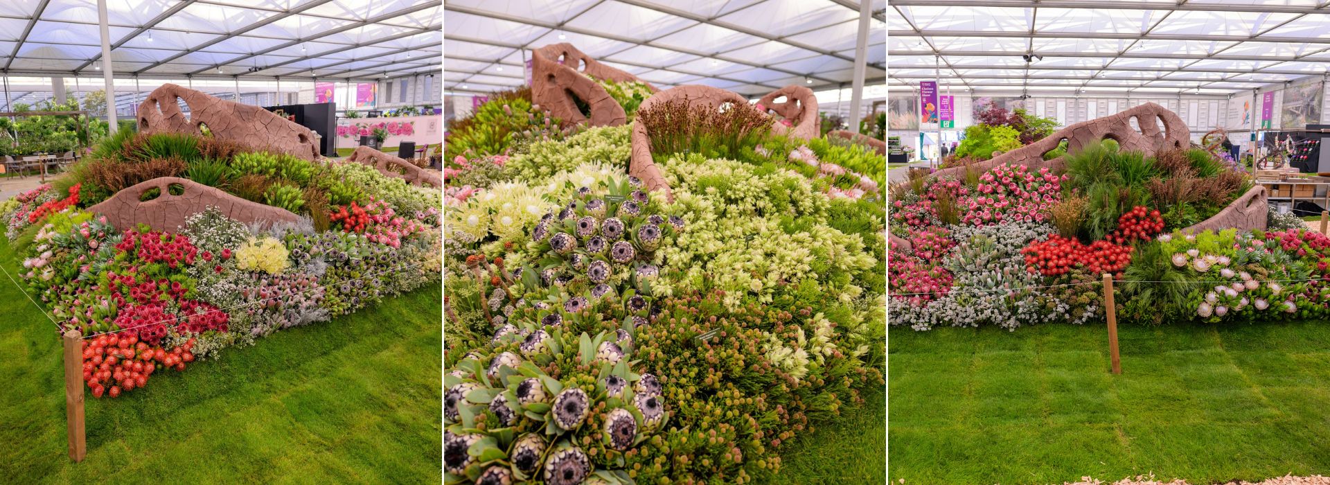 An unprecedented 22,000 stems were used in the display to create a proudly South African explosion of fynbos. This year, a special effort was made to include rarely seen hybrids such as the fan favourite protea "Snow Leopard". It also featured seldom seen species such as the pendulous Protea sulphurea and the delicate blushing brides, Serruria florida.