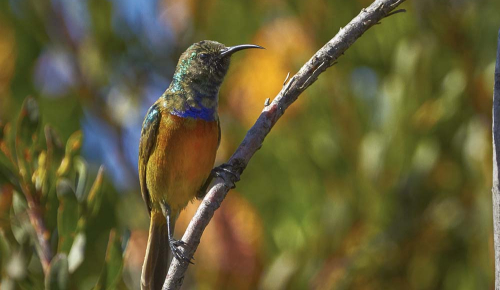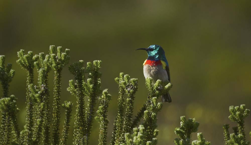 also known as the Lesser Double-Collared Sunbird is found mostly in fynbos and has an almost year-round egg-laying season which peaks in July to September.